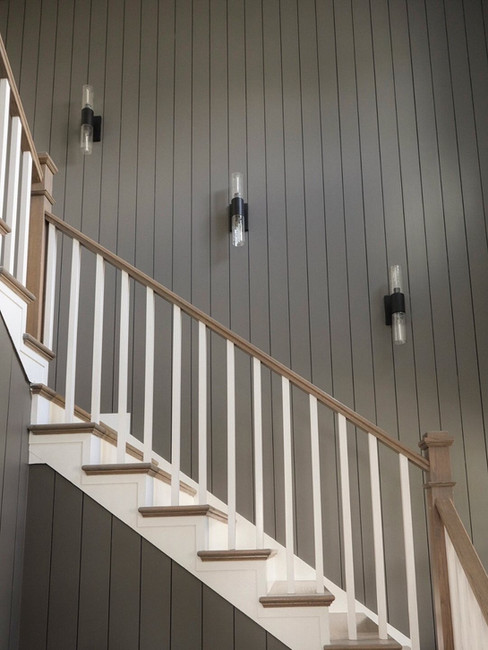 The sconces add both style and newfound functionality as they now provide stunning lighting at night. The charcoal paneling brings in the cool factor the homeowner was seeking.